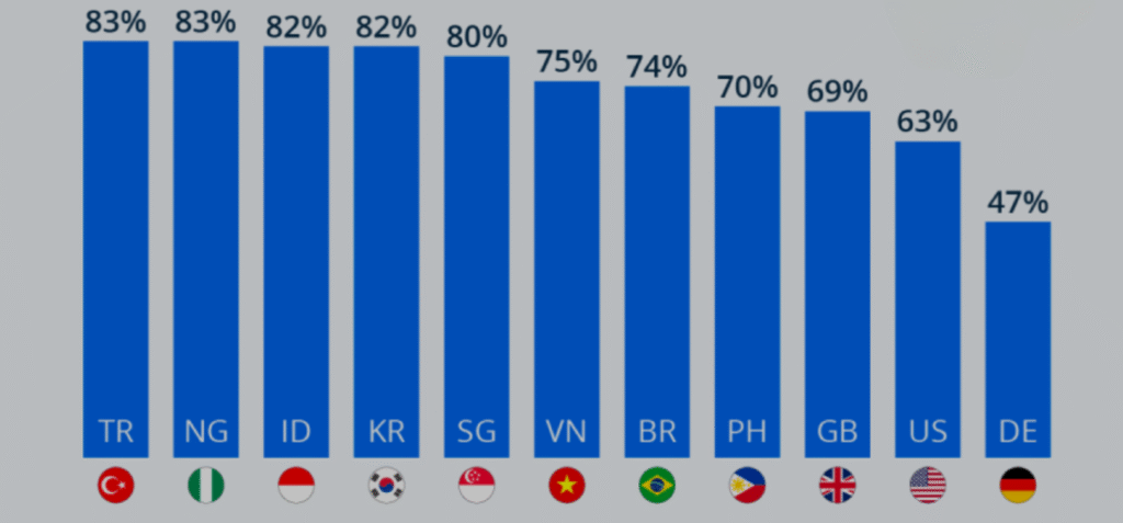 South Korea, with 82% each, had the highest percentage of mobile bank users in 2023. The most common devices used for transactions in Korea were smartphones.