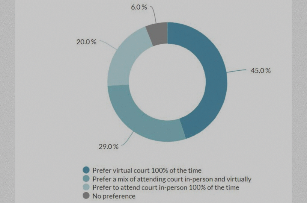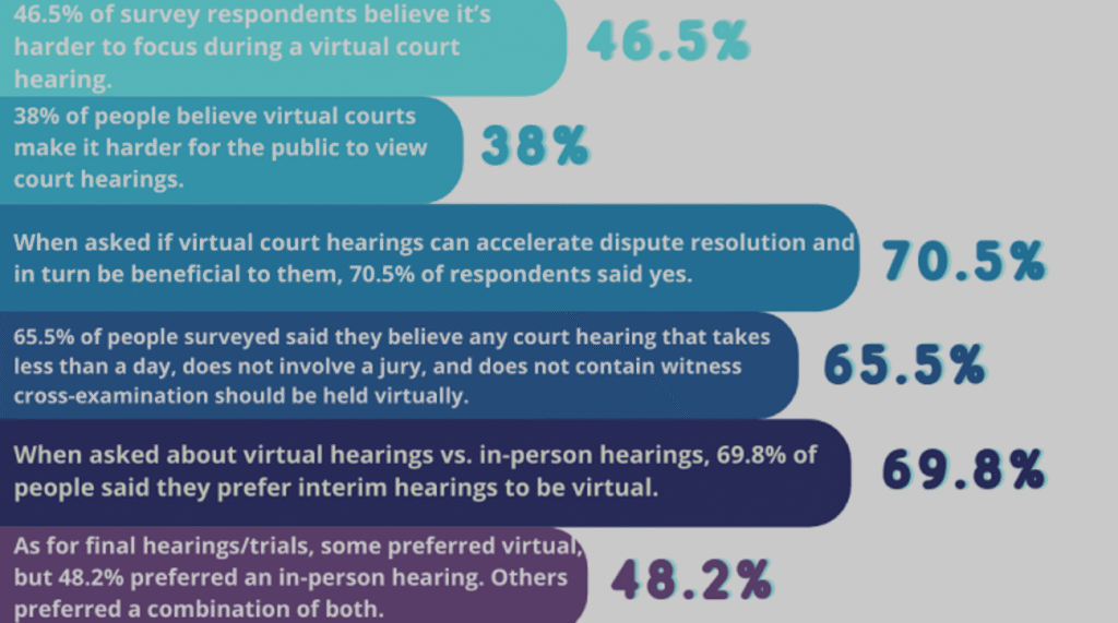 According to a 2021 report, most judges confirm the fairness and efficiency of virtual hearings. Moreover, most courts have initiated virtual civil jury trials with jurors who operate from homes.