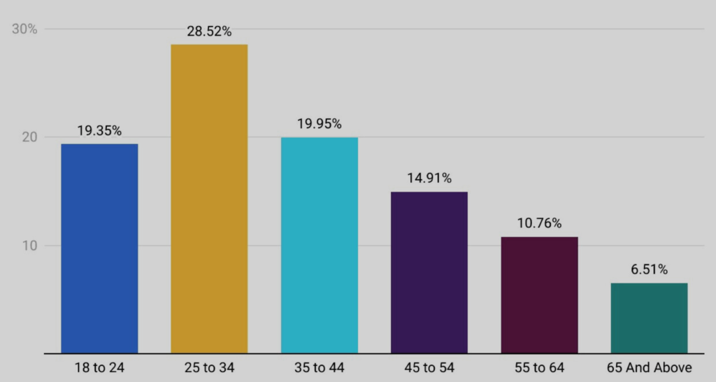 The platform’s audience is more male than female. 38% of the audience are male and 32% are female.