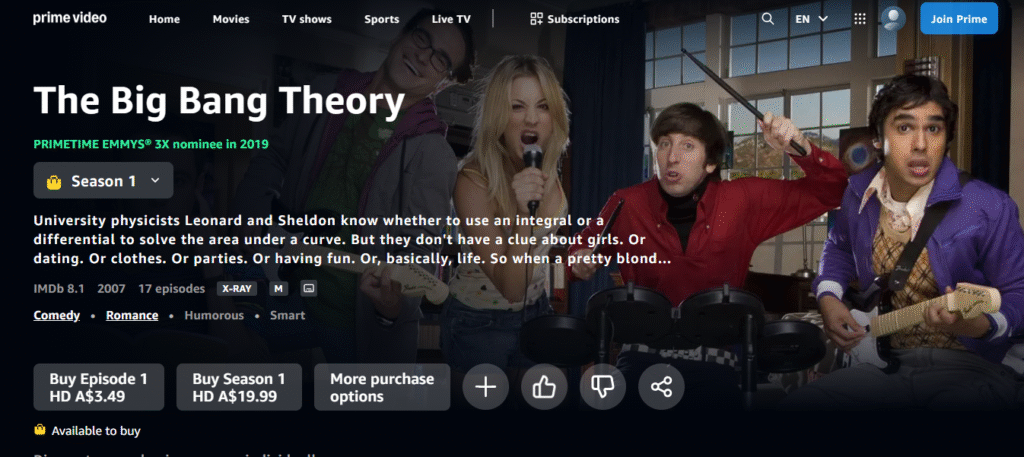 If this TV series tops your list of favorite shows, why not buy it? Purchasing the series ensures you’ll always have it at your fingertips. You can buy single episodes for $2.99 through Amazon Prime Video or an entire season for $19.99. This allows you to watch The Big Bang Theory in high definition anytime. Alternatively, you can purchase the show from Apple TV or Microsoft Store.